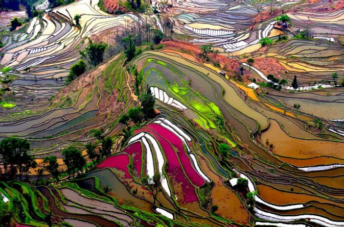 空中拍摄彩色稻田。摄影师:Thierry Bornier