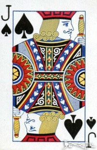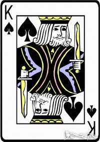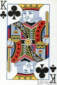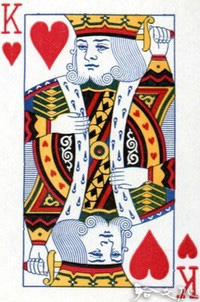 查理曼大帝法兰克国王,后加冕为"罗马人的皇帝",他在位的14年期间,发动过对伦巴德人、萨拉森人、撒克森人等的50多场战争,控制了大半个欧洲的版图,并在天使的指引下挑起了保卫基督教世界的重任。最早用凿子在木板上刻他的人物像的职员,因为不小心凿子滑动后把上唇的胡子刮掉了。此后,印红桃国王牌都是以这张画为标本。因而,只有红桃中才有没有胡子的国王牌,其头发向内卷,把剑举在头后。