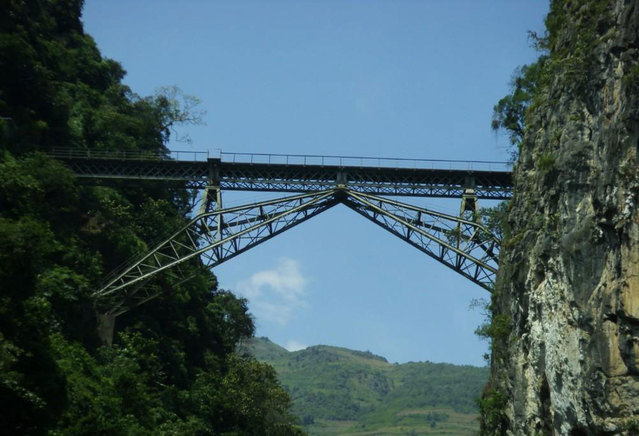 在所有的桥梁中,有座“人字桥”最为神奇。它飞架在两座相距将近70米的悬崖之间。要在这百丈深谷中建造钢桥几乎是不可能的,桥的两端即是隧道口,根本没有工作平台,而桥下则是深涧,无法树立桥墩。据说主事者智穷力竭,只好在法国公开征求设计。著名设计师保罗•波登以其独出心裁的设计,击败了他的同学、巴黎埃菲尔铁塔的设计师埃菲尔夺标。这就是著名的人字桥,是中国列入世界名桥史的两座桥之一:
