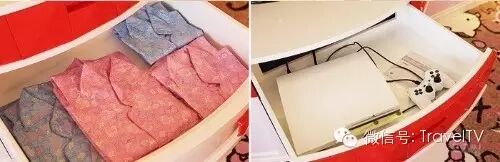浴衣和拖鞋,电视机桌子上的抽屉里有睡衣和游戏机。