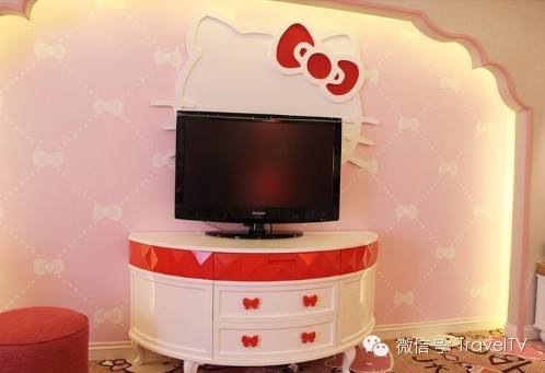 连放电视的桌子都这么有爱,壁纸和地毯都是Hello Kitty的世界……