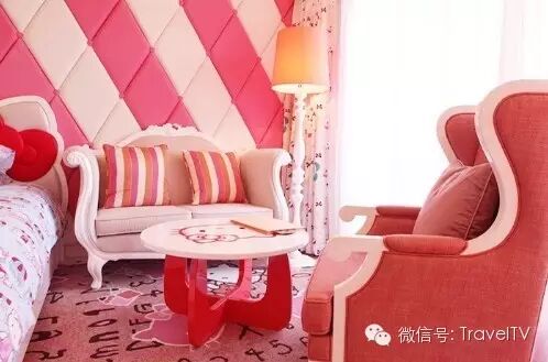 Hello Kitty的沙发,墙上的图案也应和着Hello Kitty的风格,偏向儿童的喜好!