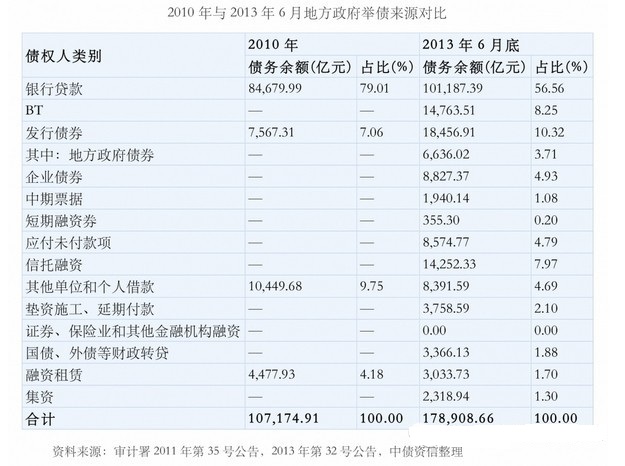 从审计署的数据可以明显看到,在截止2013年6月底,地方政府债务已经高达17.89万亿,比2010年增长66.93%,其中银行贷款10.2万亿,即使是13年6月底的地方政府负债数据,也占到了银行贷款余额总规模的14%。这些债务的举债来源分布如下: