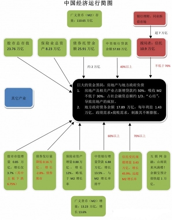 2008年的金融海啸,对中国经济也产生了巨大的冲击,政府为了维持经济增长,紧急发布4万亿的经济刺激计划,其实就是全力启动房地产和基建(政府负债)。那段时间,银行以近乎疯狂的速度放贷,疯狂到什么程度呢?我的一个同事曾经是银行支行行长,他和我说:“那会儿上面天天催着放贷款,要是不把钱放出去要被问责!”可见,那会儿的所谓“风控”已经形同虚设了。信贷的扩张,必然导致货币量的急速增长:2009年全年M2增长高达28%,11月最高时曾攀到29.74%!在大量货币的刺激下,房地产价格在经历09年上半年的下降后下半年开始逆势增长,各地的基础设施建设也如火如荼进行。房地产和基建这两个超级引擎启动后,经济被支撑了起来,2009年一季度经济GDP增长仅为6.6%,但全年却达到了9.2%的高增长!应该说,2009年,“看得见的手”的作用已经到了极致,这稳住了经济的增长,却也带来的极大的副作用:房地产泡沫迅速放大、地方政府债务快速积累、以钢铁为代表的大量行业严重产能过剩……于是,政府不得不开始收缩,房地产开始调控,开发商贷款难了;严控政府平台贷款,政府平台贷款不容易了。但是这两个超级引擎降速了,谁来扛起经济增长的大梁呢?新兴产业吗?别逗了!经济转型不是一两天的事情,全球经济下行的时候谈转型更是不靠谱。中国经济面临的局面就是“蜀中无大将”!除了房地产、基建,还是房地产、基建!怎么办?这个时候,非标出现了,其中最典型、规模最大的就是信托。说白了,就是国家不让银行从表内贷款,那好,银行通过发行理财产品,把储户的钱从表内负债中转移到理财产品中,然后把理财资金的钱给信托公司,美其名曰“委托信托公司投资”,其实钱是银行的钱,所投的项目也是银行的项目,信托公司只是在里面做了一个通道而已,这就是所谓的“银信合作”。通过这种方式,银行成功地规避了国家政策的限制,同时把钱放给了房地产和政府。通过几年的发展,信托这个本来在金融行业毫无地位的子板块,一跃以10万亿的规模超越保险,成为仅次于银行的中国第二大金融板块。从投向来说,以我的经验,说这10万亿中有70%以上投向了房地产和政府都算是保守的,很多项目在表面上看起来是投向了所谓“工商企业”,或者是所谓“股权投资”,或者更高级的所谓“财产权信托”,实际钱都流到了房地产和政府手中。就这样,通过非标的撮合,两个本来应该降速的超级引擎又转起来了,银行也能赚钱了,GDP又能保持平稳增长了!