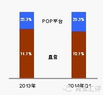 直营模式的京东,目前主要收入来源直营商品收入,但来自POP平台的收入也在不断增长,2013年达到25.3%。2013年京东的毛利率为9.9%。之前处于亏损状态,2013年实现break even,净利润2.24亿元。净利率0.3%。