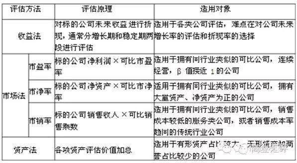 目前,评估机构对于企业估值一般多采用资产法、收益法和市场法三种评估手段。一般情况下,对于同一个标的应采用两种方法进行评估,互为验证。三种评估方法的评估原理和适用对象如下表所示: