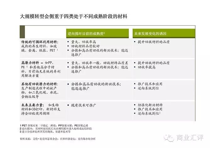 制定其他材料的执行标准可以促成进一步的行动。在研究中,我们找出了四类材料,它们所处的循环发展阶段各不相同,在企业如何选准试点项目的切入点并迅速见效上具有现实意义(见图3)。