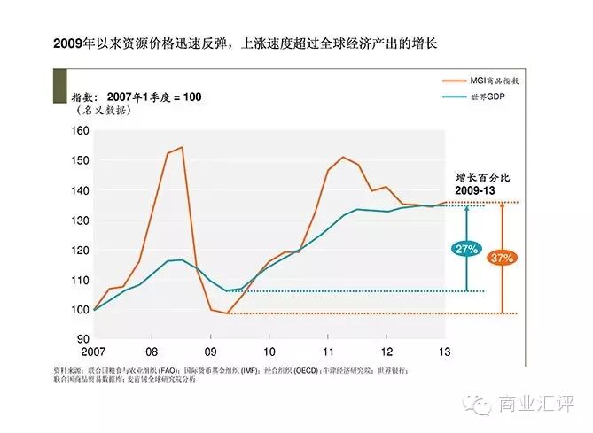 如今,这种线性的工业模式已面临越来越大的压力。到2030年,发展中国家将约有30亿消费者加入中产阶级行列。如此空前的规模及其带来的剧变势必引发企业和市场的震动,一方面商品价格日益上升且难以捉摸、企业生存空间遭受挤压,另一方面竞争更加激烈,需求更是雾里看花。新千年伊始,资源价格转而上涨,短时间的涨幅已经开始抹煞过去一个世纪以来实际价格的下滑。然后,一场自大萧条以来最严重的经济低迷迅速地打压了需求,但令人意想不到的是,自2009年起资源价格再次反弹,且速度超过了全球经济总产出的增幅(见图1)。显然,忽略资源成本的时代已宣告结束。