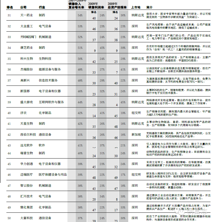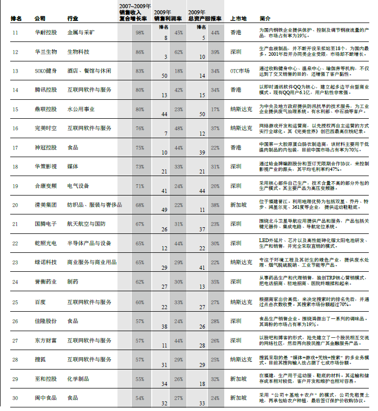 我们所用的标准,就是每家公司2007至2009年“销售收入的年均复合增长率”。它反映一家企业在2008、2009连续两年,销售收入以怎样的速度平稳增长。