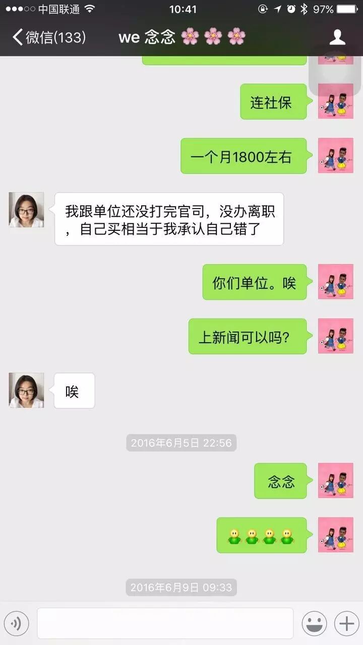 后来她的病友发来一张聊天记录,我才明白。记录里面刘伶利说,“我和单位还没打完官司,没办离职,自己买相当于我承认自己错了。”